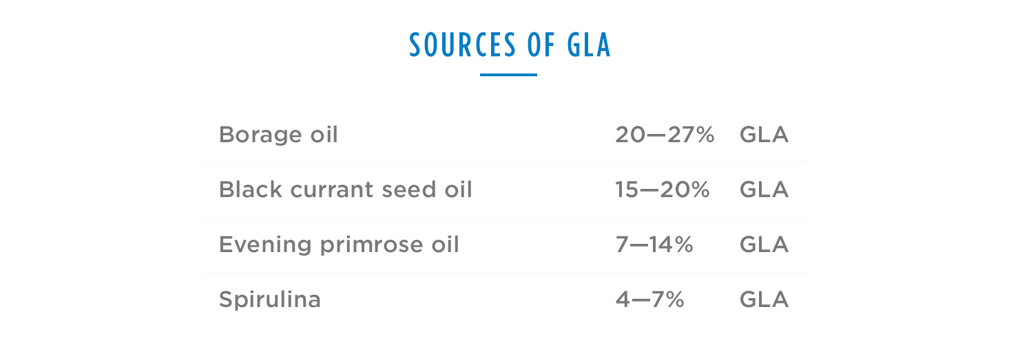 GLA is a plant-derived fat that can be difficult to come by in food. Evening primrose oil, black currant seed oil, and borage oil contain the highest amounts of GLA. Oatmeal, hemp seeds, and spirulina (blue-green algae) also contain GLA.