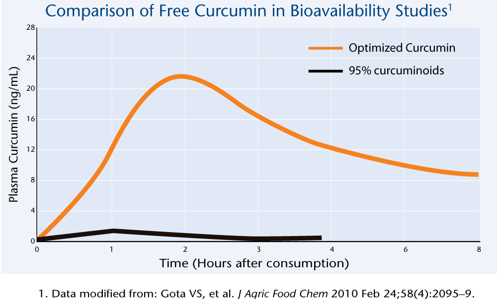Newer innovations in supplemental curcumin formulation, however, have made it possible to produce curcumin in a form that is readily absorbable and utilized by the body. In clinical studies, “optimized curcumin” has been shown to be 65 times more bioavailable than standard curcumin extract.*