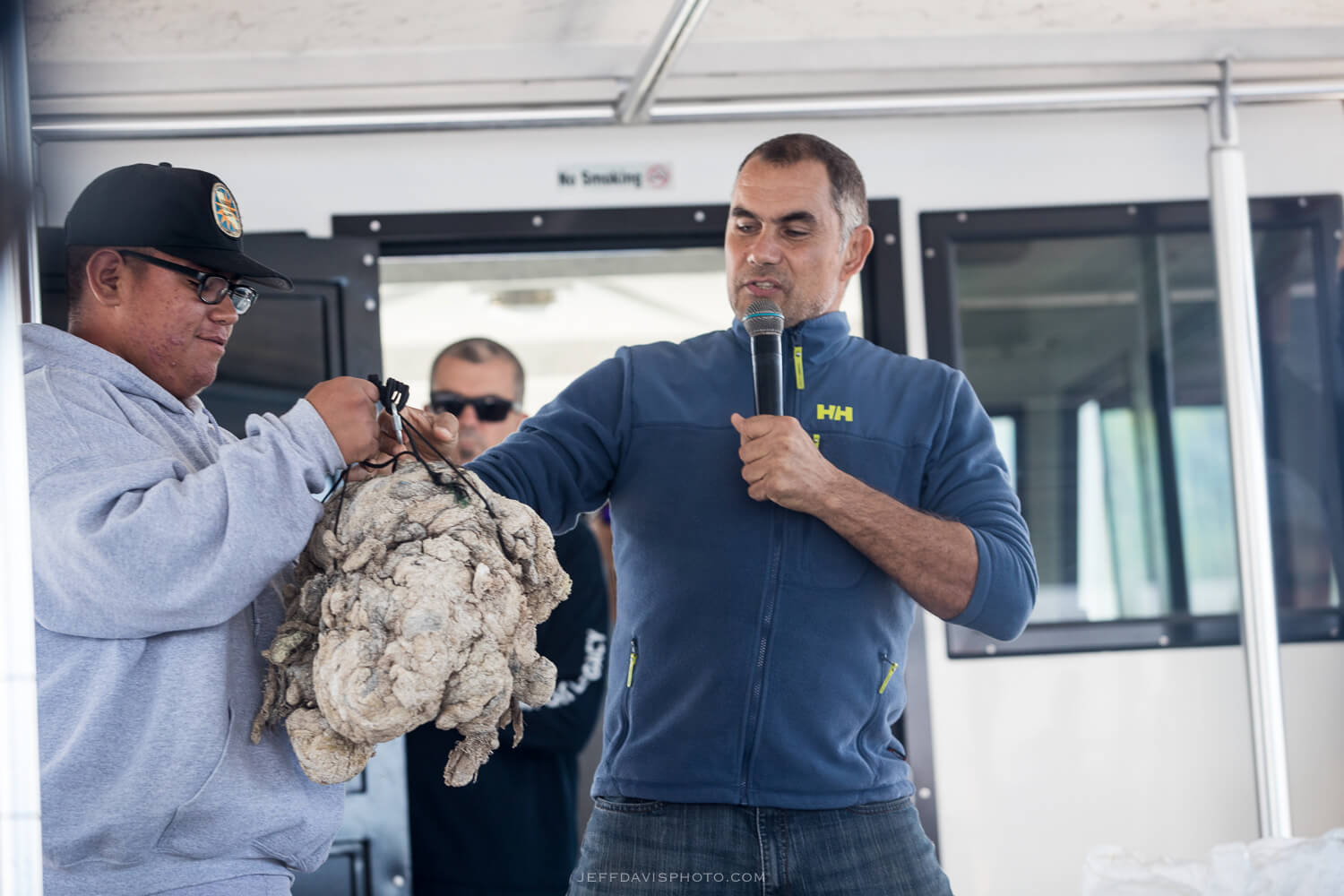 5 Gyres Research Director Marcus Eriksen explains how this tangle of plastic rope and netting found its way into the belly of a camel. Photo credit: Jeff Davis
