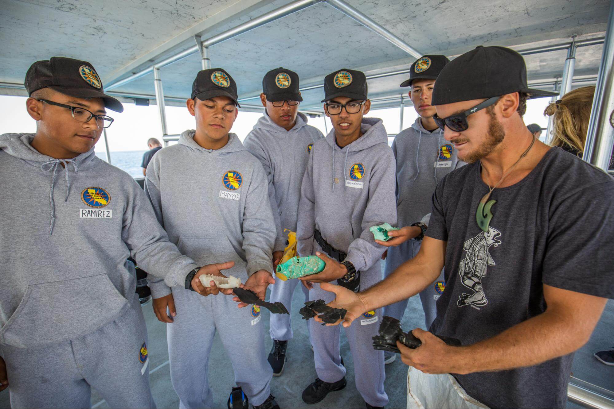 High school students from Sunburst Youth Academy, along with pro surfer and 5 Gyres ambassador Zane Schweitzer, take a look at plastic trash pulled from the ocean. Photo credit: Georgia Schofield/Starboard