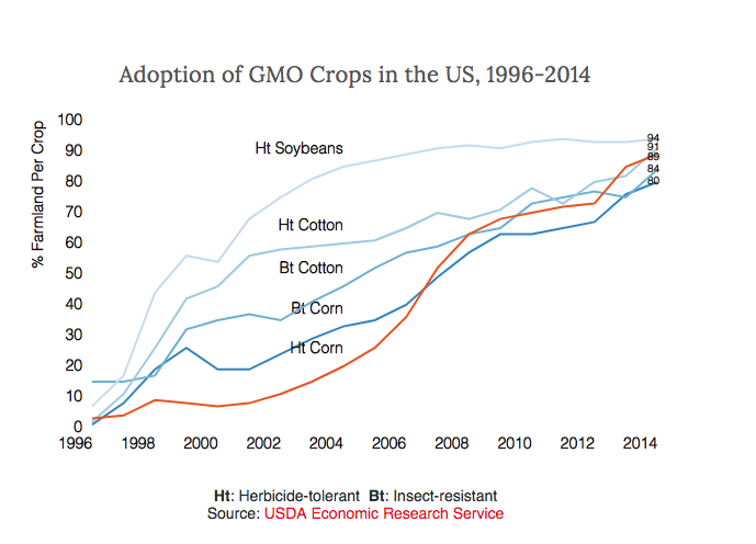 Genetically modified crops have been widely grown in the U.S. over the past 20 years. The most commonly grown GMO crops today are those—largely soybeans, cotton, and corn—that are engineered to make plants able to withstand specific herbicides, such as Monsanto’s Roundup, and those that are engineered to include organic bacteria that make plants toxic to insects.